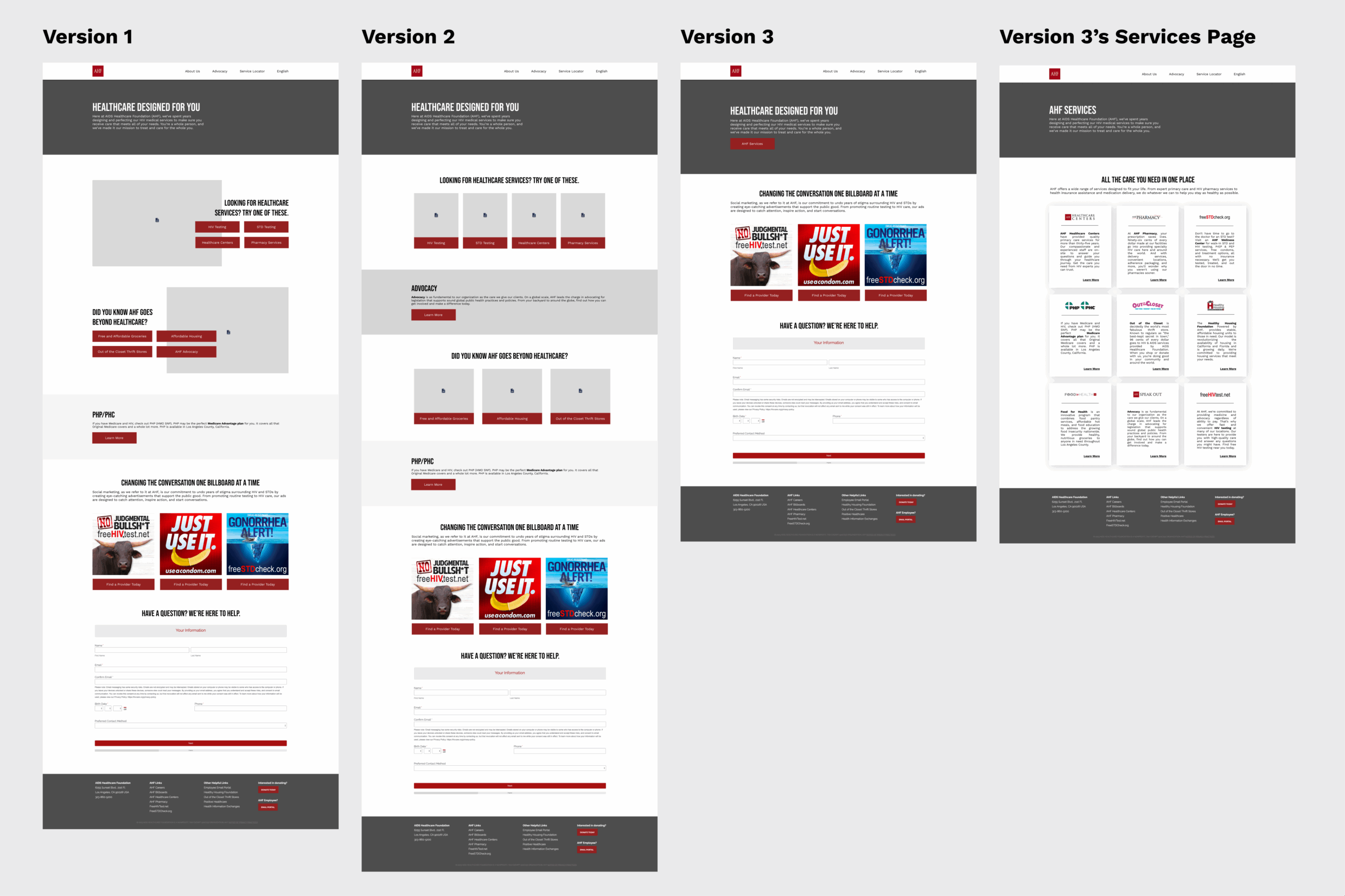 The website faced several usability problems, including difficult navigation throughout the single-page website, an outdated design that did not match the rest of the organization's digital properties, and confusion among users differentiating this website from the main organization's website (www.aidshealth.org). This project required a deep understanding of the website's purpose, concept exploration in design, and educating stakeholders on testing and research.