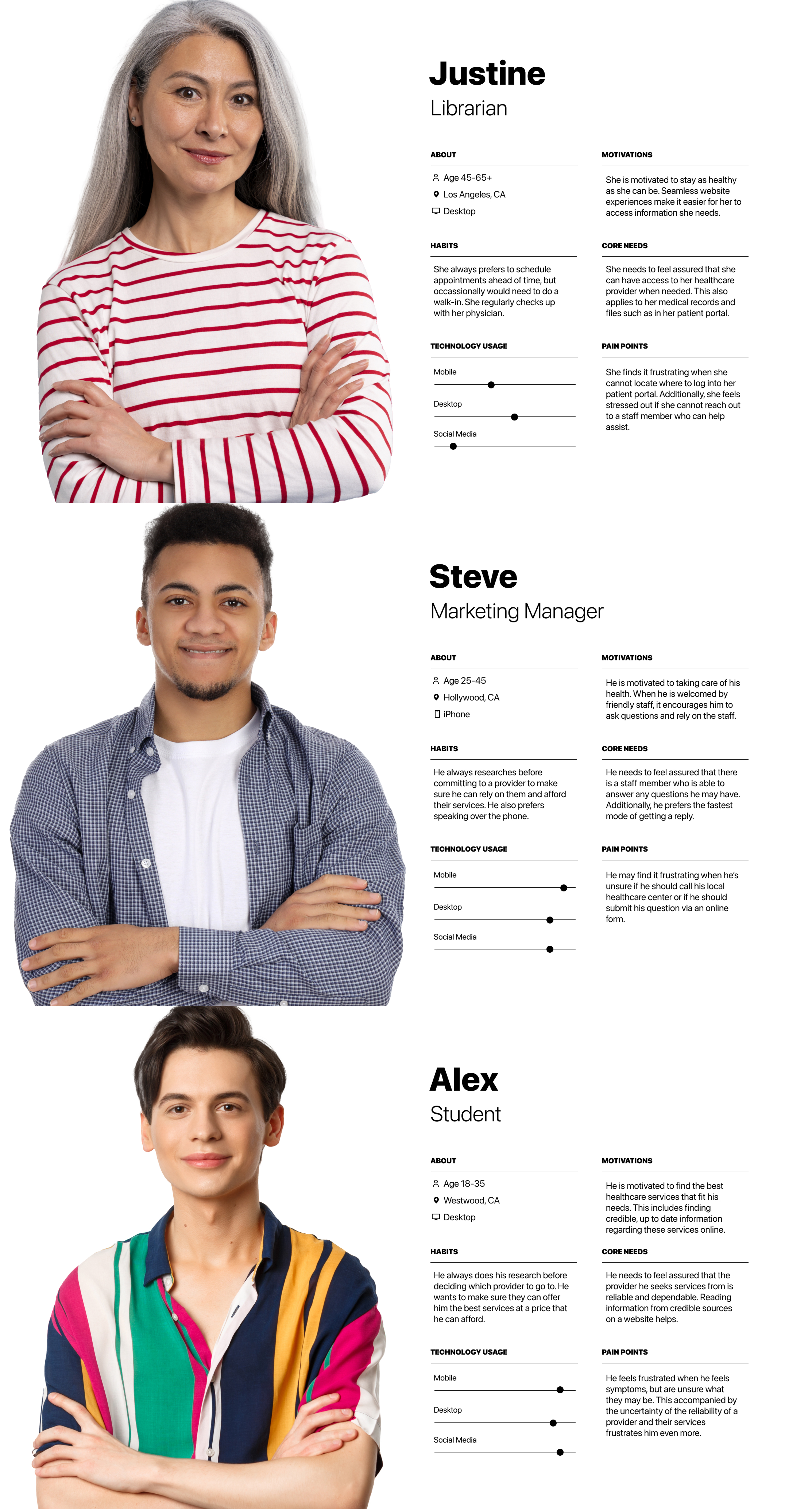 Through the analysis of our database, survey responses, and usability test results, I was able to construct user personas for current patients, prospective patients, and those seeking information. This allowed me to thoroughly address the distinct needs for each user group.