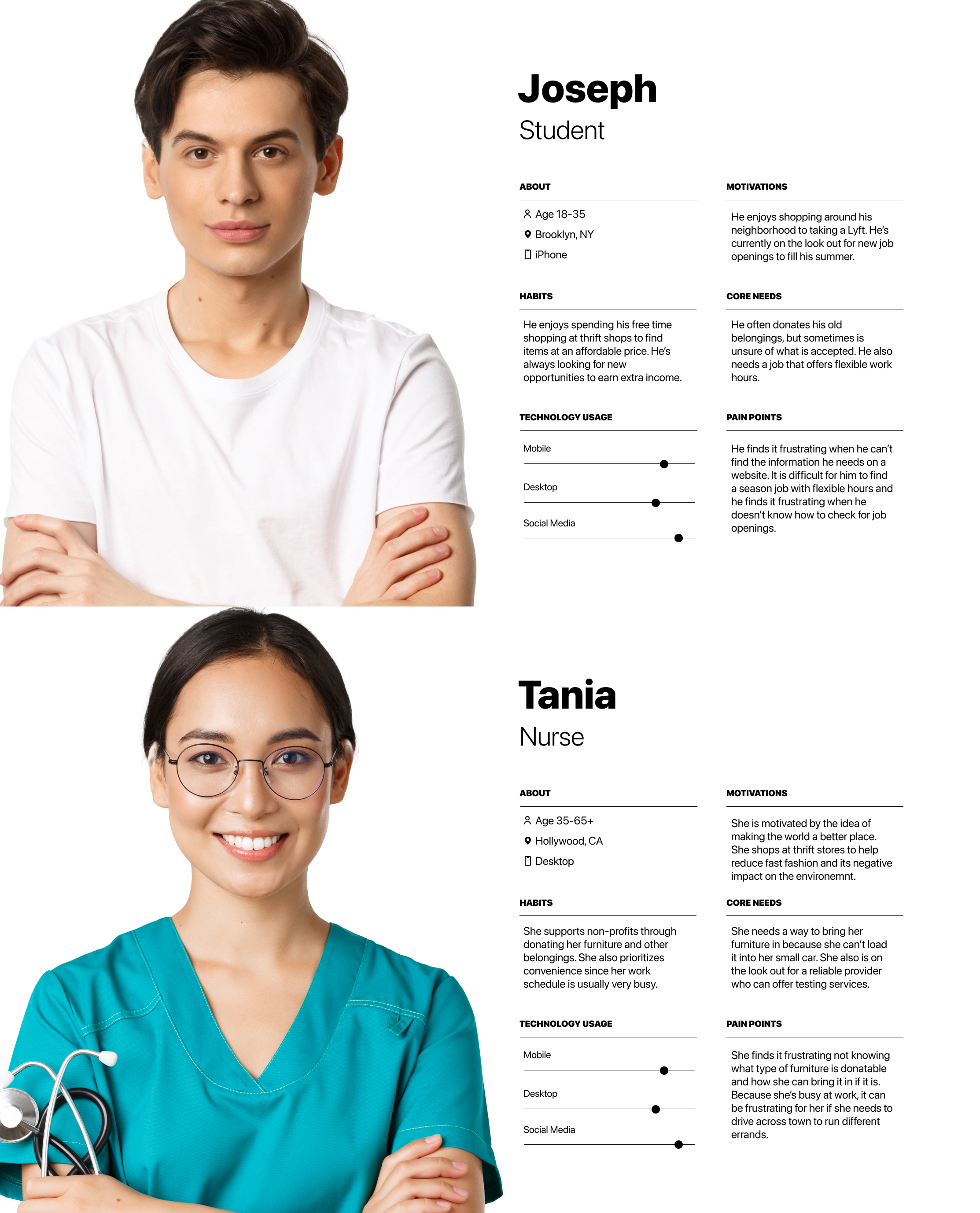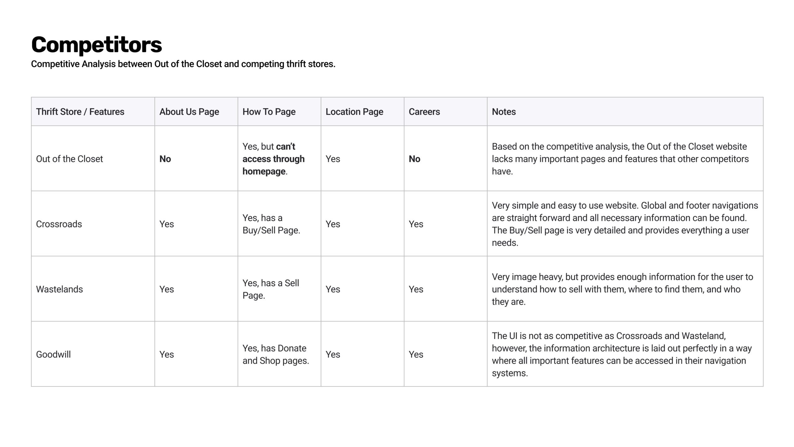 To better understand the competitive landscape, I conducted an analysis of how competitors communicated their value propositions through their websites. This helped uncover gaps in our own website, including missing information that users found helpful, such as an "About Us" and "How To Donate" pages, as well as career opportunities. This helped give direction while learning more about the users. Through our database, we were able to uncover the insights to help construct user personas.